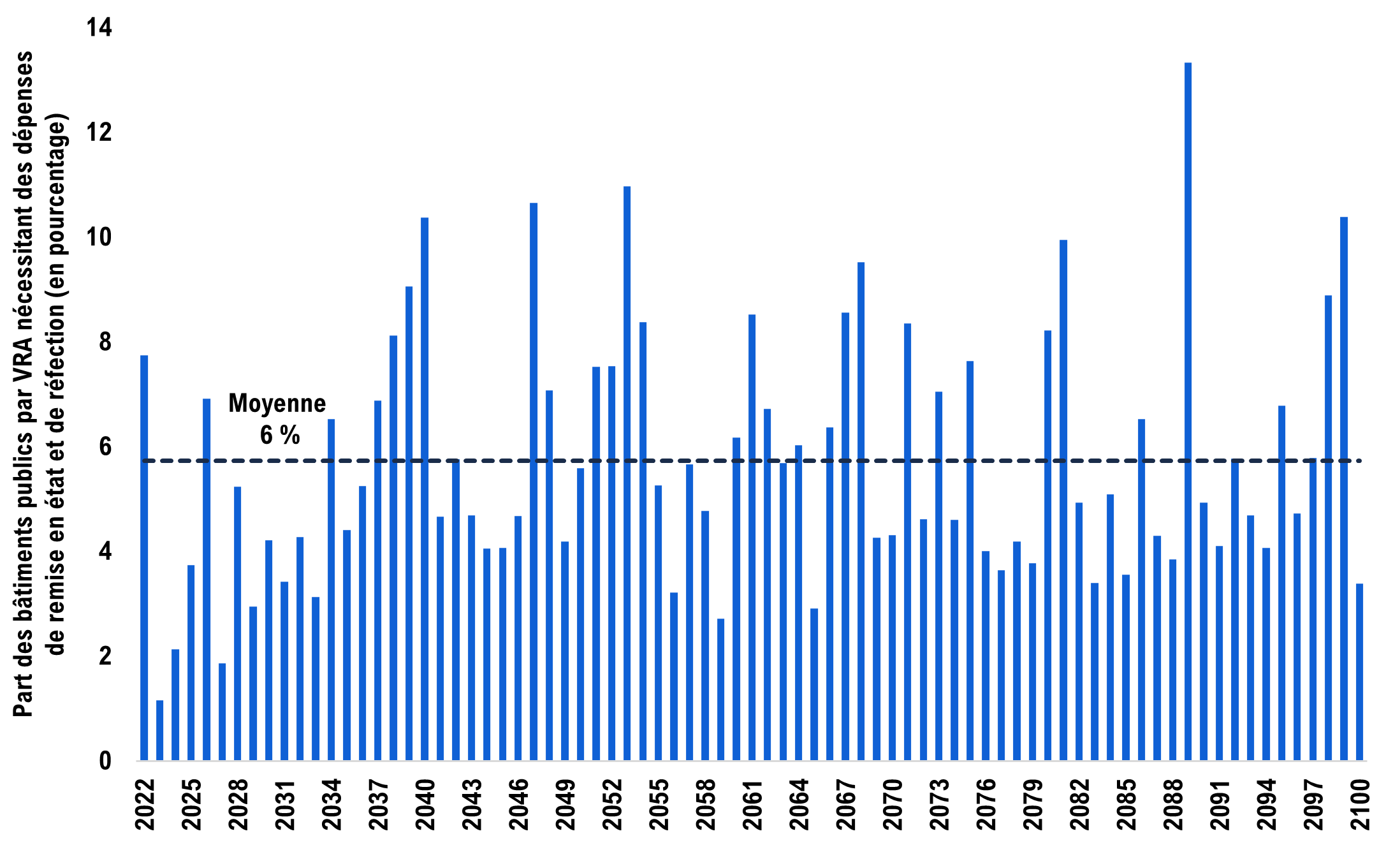 Bien que les dépenses d’E et E soient annuelles, le calendrier des dépenses pour travaux de réfection et de remise en état dépend de l’ancienneté et de l’état d’un bâtiment. Le graphique 3-2 montre la proportion annuelle de bâtiments publics de l’Ontario (par VRA) qui nécessiteraient des dépenses de remise en état ou de réfection jusqu’à la fin du siècle, si les financements nécessaires pour remettre et maintenir le parc actuel de bâtiments publics en bon état de fonctionnement étaient mis à disposition et dépensés en temps utile[21]. En moyenne, environ 6 % des bâtiments nécessiteront une remise en état ou une réfection chaque année.