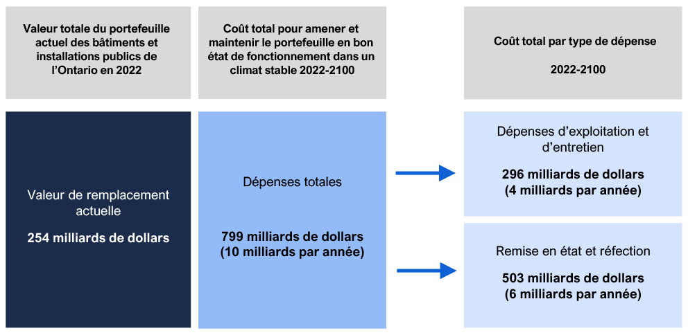 Le coût cumulé pour remettre et maintenir le parc actuel de bâtiments publics de l’Ontario en bon état de fonctionnement jusqu’en 2100 dans un climat stable serait de 799 milliards de dollars, ou une moyenne d’environ 10 milliards de dollars par an. Ce coût de référence inclut 296 milliards de dollars de dépenses d’E et E cumulées et 503 milliards de dollars de dépenses de remise en état et de réfection jusqu’en 2100.