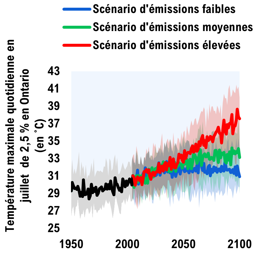 Cette section résume comment les changements prévus liés à ces dangers climatiques impacteraient les bâtiments publics de l’Ontario en l’absence de mesures d’adaptation. Elle présente ensuite les estimations du BRF pour les coûts à long terme supplémentaires que ces dangers climatiques feraient porter sur le parc de bâtiments publics de l’Ontario en présence des scénarios basés sur des émissions moyennes et élevées.
