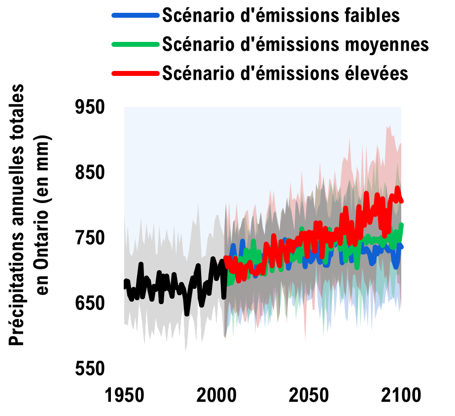 [29]Le cinquième rapport d’évaluation du Groupe d’experts intergouvernemental sur l>’évolution du climat (AR5), publié en 203, présentait quatre scénarios nommés Trajectoires de concentration représentatives (ou RCP, pour Representative Concentration Pathways). Le scénario basé sur des émissions faibles correspond au RCP2.6, le scénario basé sur des émissions moyennes est le RCP4.5 et le scénario basé sur des émissions élevées est le RCP8.5. Consulter le Cinquière rapport d’évaluation du GIEC. Le sixième rapport d’évaluation du GIEC (AR6), publié en 2021, contient cinq scénarios nommés Trajectoires socioéconomiques partagées (ou SSP, pour Shared Socioeconomic Pathways) qui ont été harmonisés avec les scénarios RCP du rapport AR5 en ce qui a trait au réchauffement moyen. Ceci signifie que les scénarios RCP du rapport AR5 sont toujours pertinents.