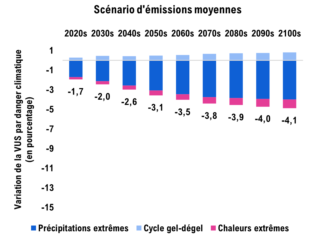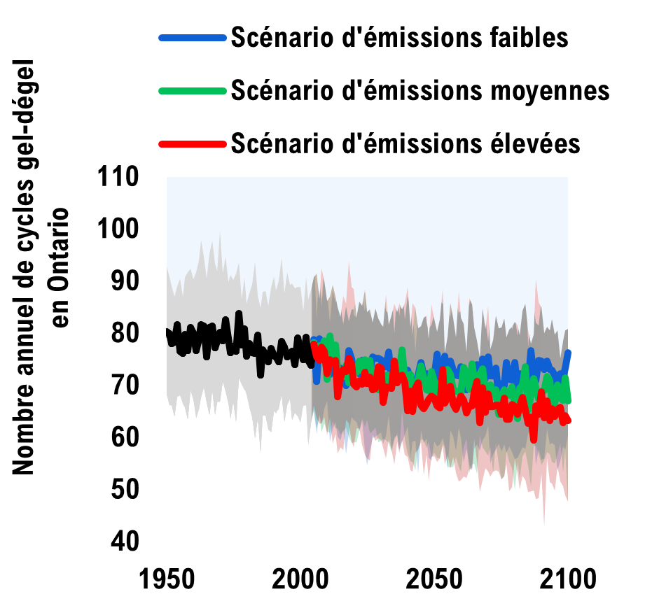 [34] Étant donné que le nombre de cycles gel/dégel annuel devrait diminuer selon tous les scénarios, ce danger climatique est exclu de l’analyse dans cette section.