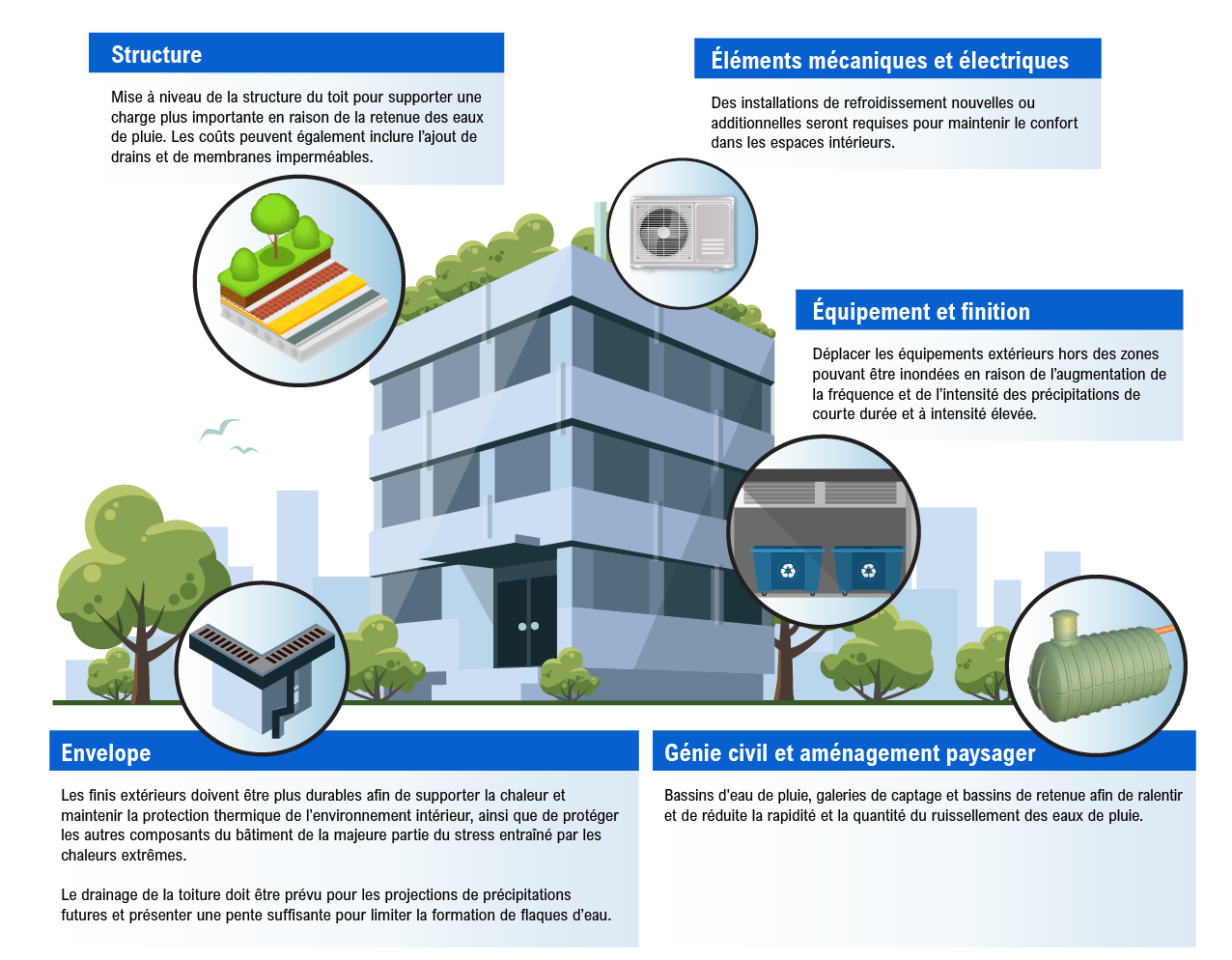 [9] Une fois adaptés, les bâtiments publics ne sont plus soumis à une détérioration accélérée ou à des dépenses d’exploitation et d’entretien supplémentaires induites par les épisodes de précipitations intenses et de chaleurs extrêmes.
