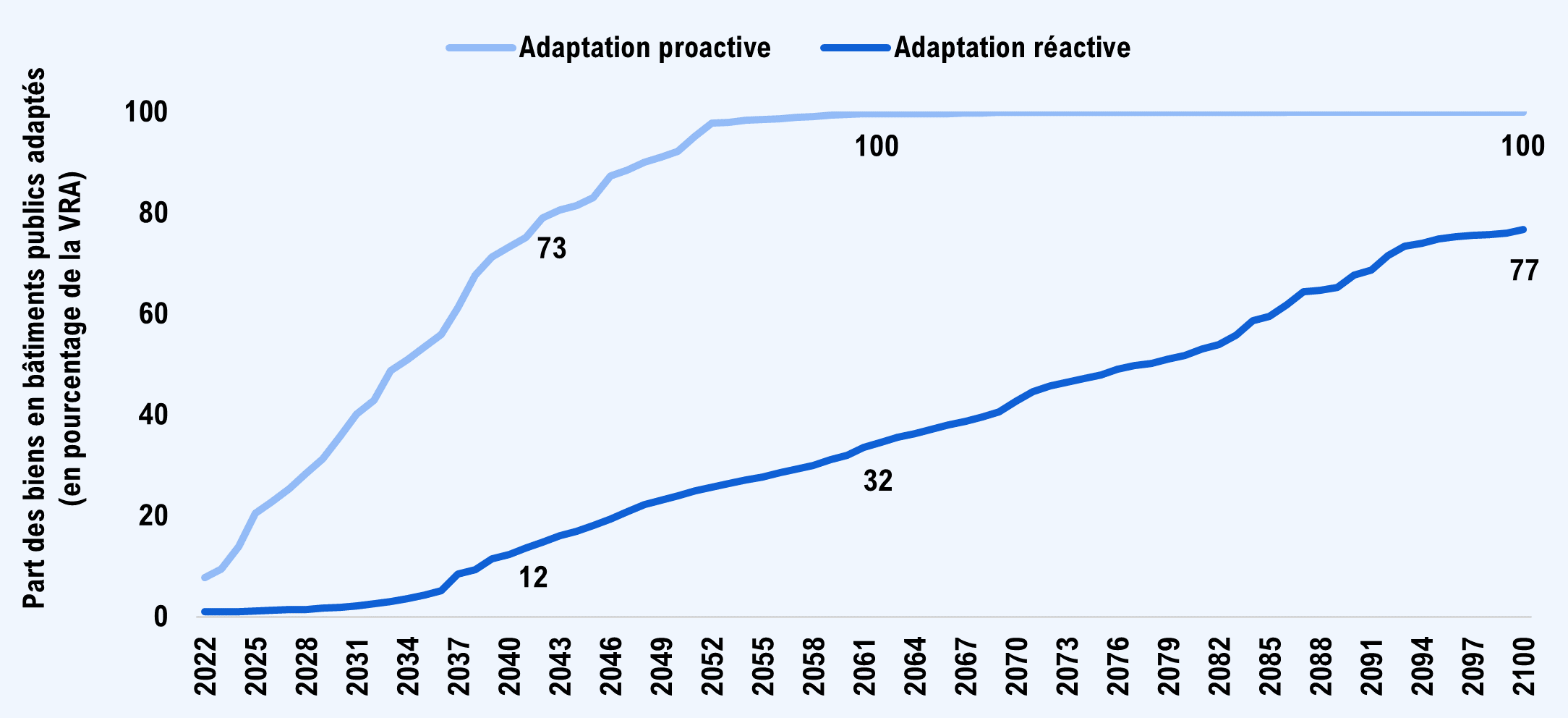 La stratégie proactive suppose que la plupart des bâtiments sont rénovés avant la fin de leur vie utile pour résister aux précipitations extrêmes et aux chaleurs extrêmes des projections pour la fin du siècle, et que presque tous les biens seront adaptés d’ici 2060. L’adaptation proactive des bâtiments publics pour résister aux précipitations extrêmes et aux chaleurs extrêmes du scénario basé sur des émissions moyennes coûterait 54 milliards de dollars supplémentaires (6,7 % de plus que les coûts de référence) cumulés d’ici 2100. Alors que l’adaptation pour le scénario basé sur des émissions élevées coûterait 104 milliards de dollars (13,1 % de plus que les coûts de référence)[10].