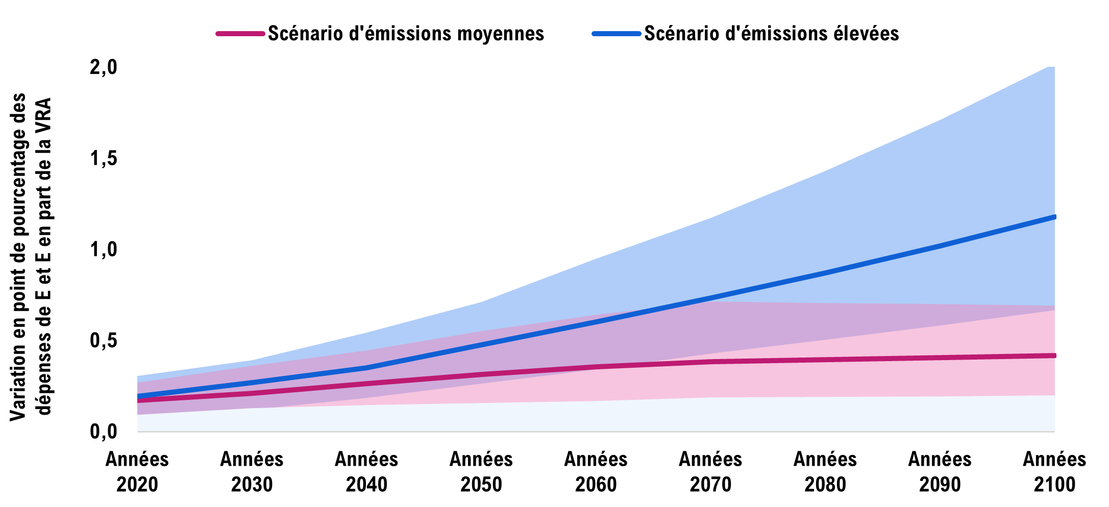Remarques : la ligne pleine est la projection médiane (ou 50e percentile). Les bandes colorées représentent la plage de résultats possibles de chaque scénario. Les coûts présentés dans ce tableau s’ajoutent aux projections de coûts de référence sur la même période.