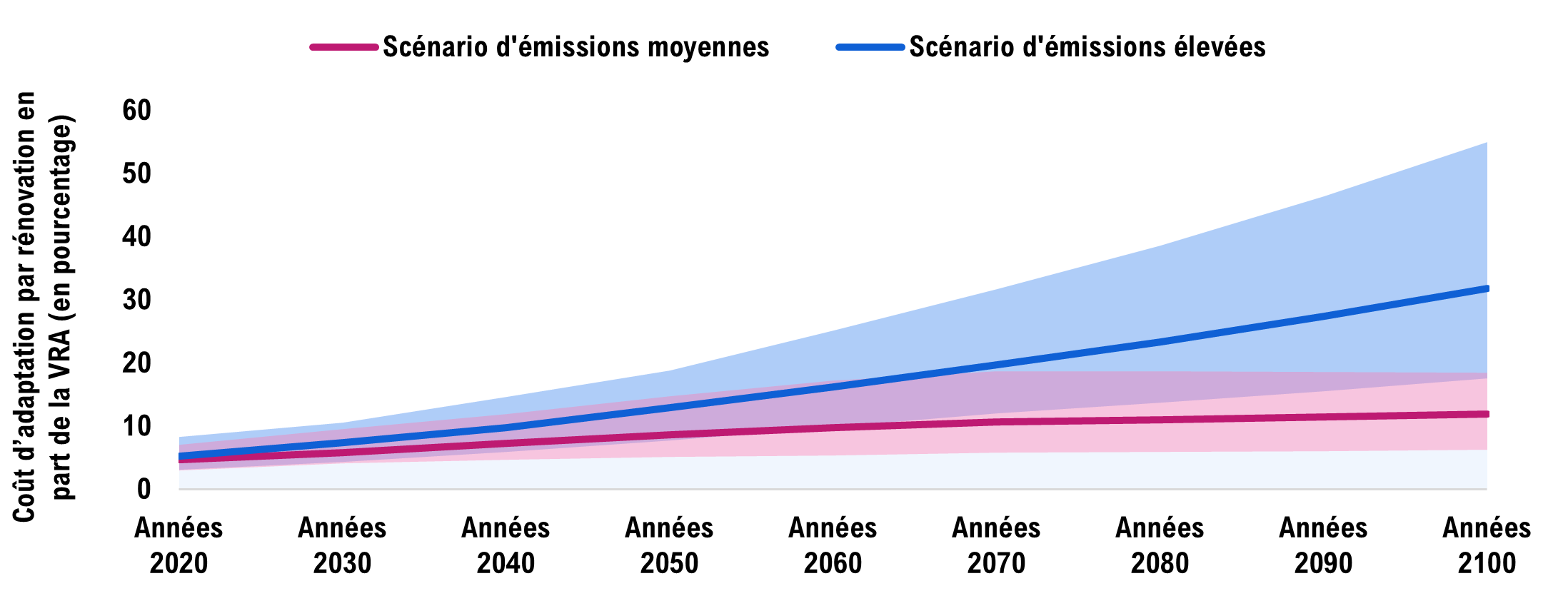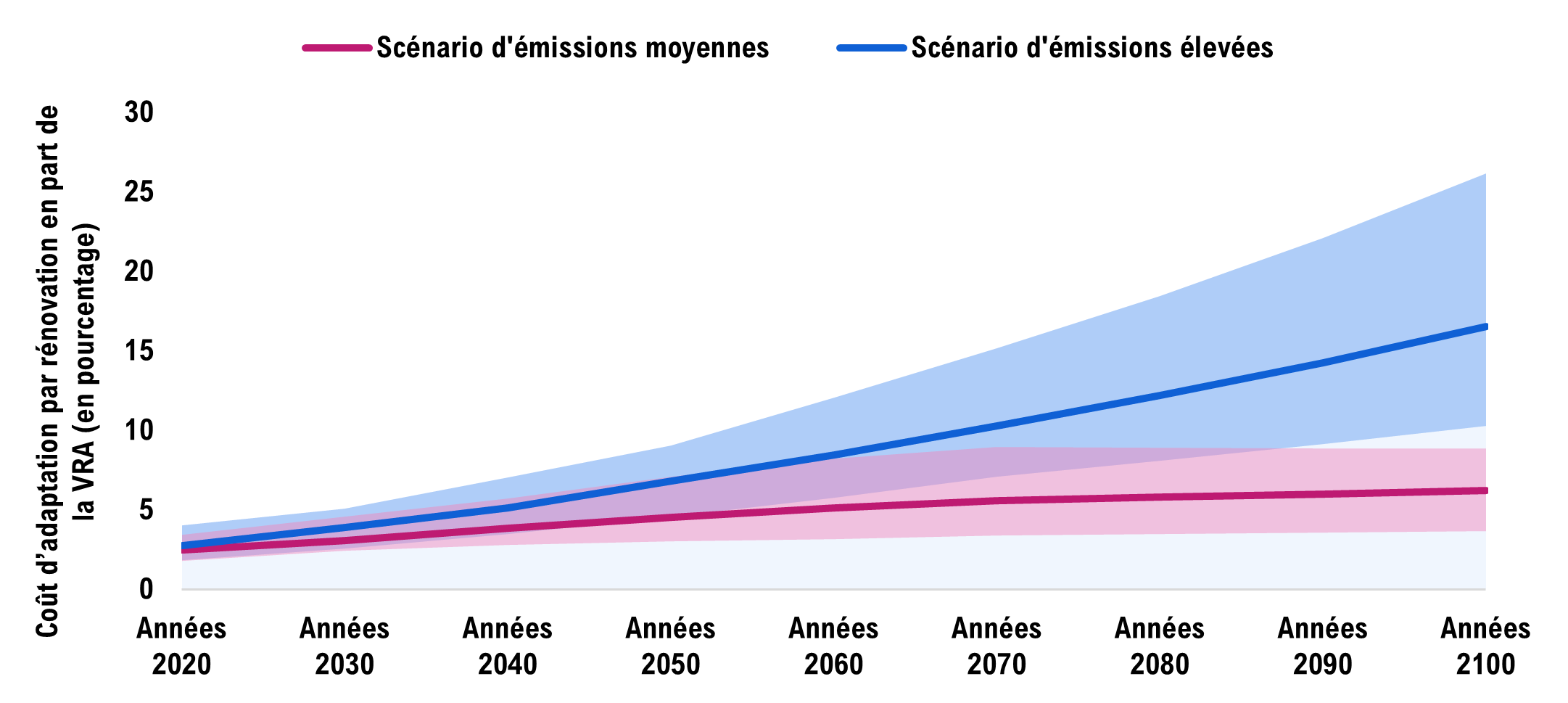 [45] Ces coûts d’adaptation permettent de mettre en œuvre des mesures visant à résister aux impacts climatiques associés aux projections médianes de précipitations intenses et de chaleurs extrêmes.