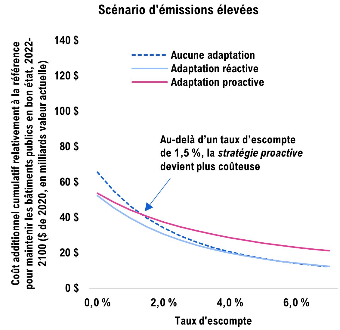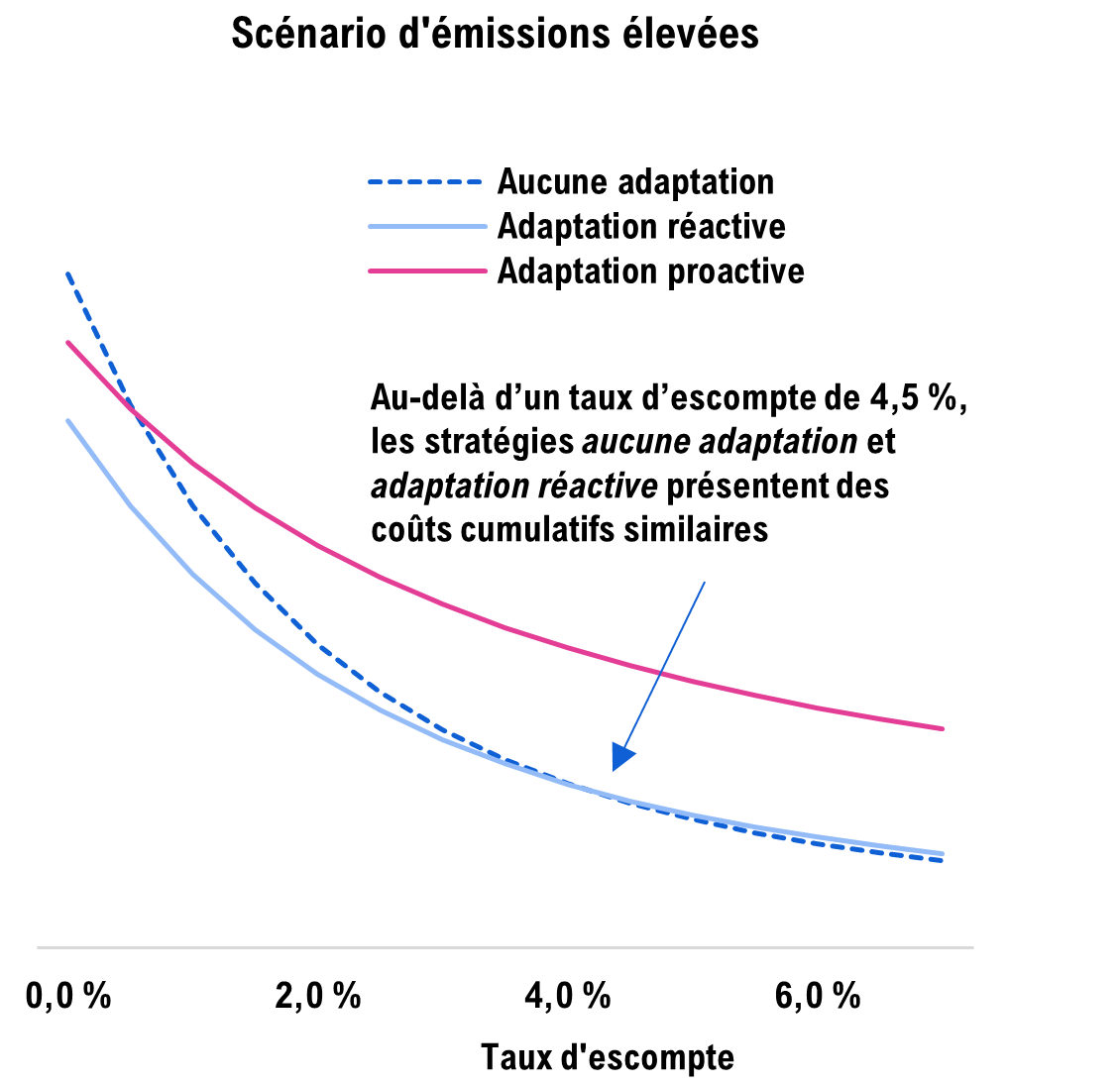[12] Sur une base actualisée, la stratégie d’adaptation réactive est, d’un point de vue cumulatif, moins coûteuse que l’absence d’adaptation à des taux d’escompte inférieurs allant de 4,5 % à 5,5 % selon les scénarios d’émissions. Voir l’annexe D pour plus de détails.