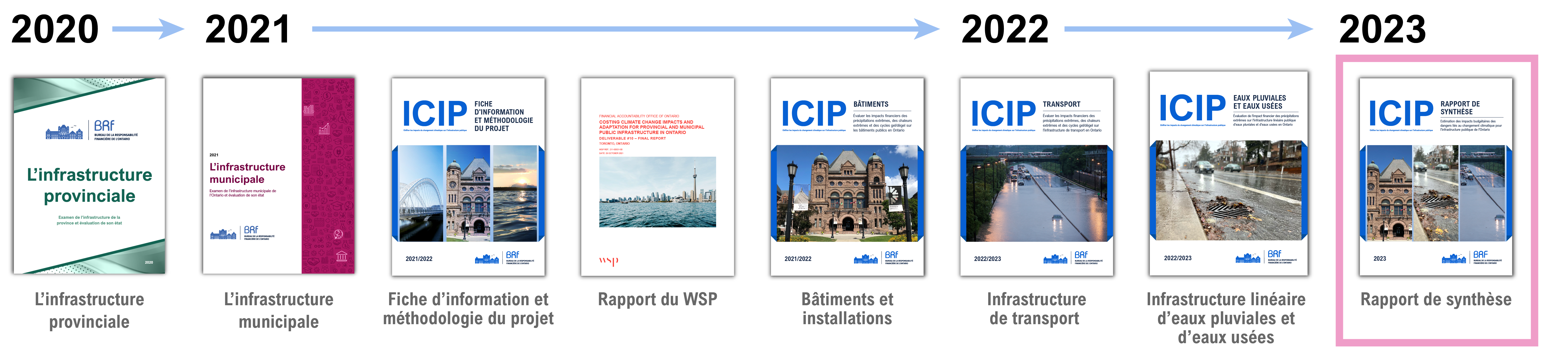 Le projet a débuté par la rédaction de deux rapports évaluant la composition et l’état de fonctionnement de l’infrastructure municipale et provinciale. Ensuite, à l’automne 2021, le BRF a publié trois rapports : un document d’information qui décrit le contexte global et la méthodologie du projet ICIP, un rapport préparé par WSP Global qui décrit les informations techniques détaillées sur l’impact des dangers climatiques pour l’infrastructure publique, ainsi que le premier rapport sectoriel ICIP, qui décrit comment l’évolution de ces dangers climatiques aura un impact sur les coûts à long terme pour le maintien en bon état de fonctionnement des installations et bâtiments publics de l’Ontario. Ces documents ont été suivis par des rapports sectoriels sur l’infrastructure de transport, puis l’infrastructure linéaire d’eaux pluviales et d’eaux usées.