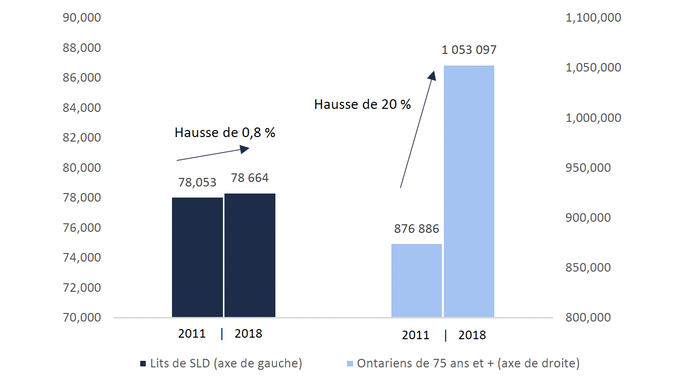L’allongement de la liste d’attente et des temps d’attente pour les soins de longue durée est attribuable surtout à la forte croissance du nombre de personnes âgées de 75 ans et plus en Ontario, associée à un investissement insuffisant dans de nouveaux lits de soins de longue durée. De 2011 à 2018, le nombre de lits de soins de longue durée en Ontario s’est accru de seulement 0,8 %, alors que la population des personnes âgées de 75 ans et plus a connu une hausse de 20 %.