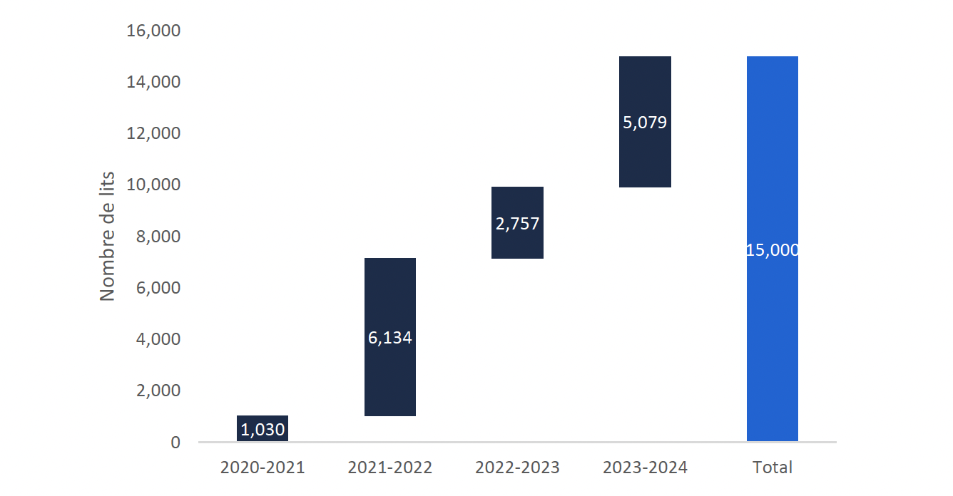 Le BRF estime que la province doit attribuer les 7 111 lits restants d’ici mars 2021 pour qu’ils soient en service avant la fin de l’exercice 2023-2024. Le graphique suivant illustre les prévisions du BRF concernant l’exercice où les nouveaux lits seront en service.