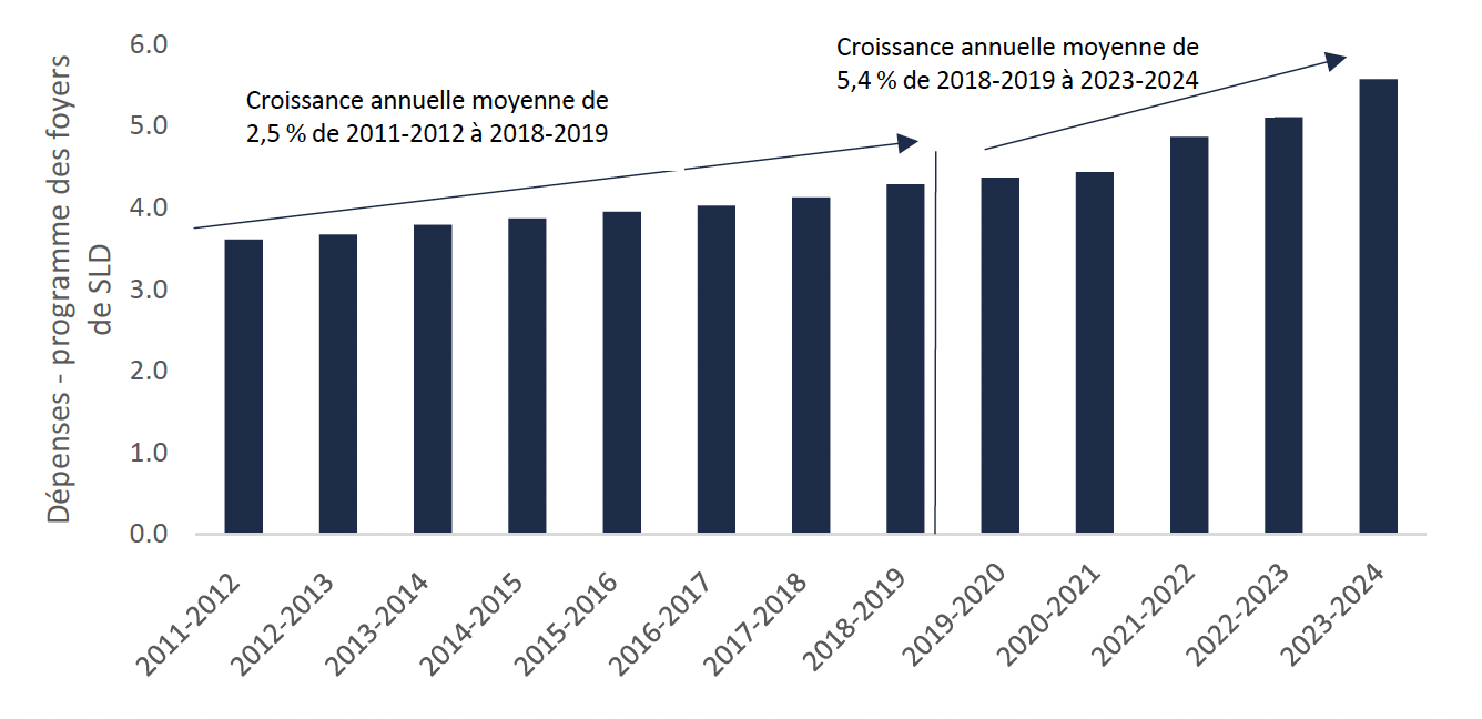 Ces 15 000 nouveaux lits constituent la première augmentation importante de l’offre de lits de soins de longue durée en plus de 15 ans, et elle fera en sorte que les dépenses au titre du programme des foyers de SLD connaîtront une croissance beaucoup plus rapide que la moyenne historique. Le BRF estime que les dépenses totales au titre du programme des foyers de SLD augmenteront en moyenne de 5,4 % par année au cours des cinq prochaines années, passant de 4,3 milliards de dollars en 2018-2019 à 5,6 milliards de dollars en 2023-2024.