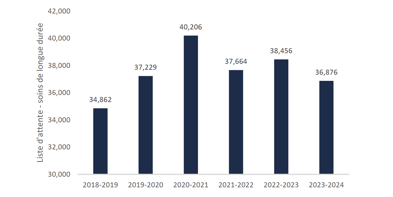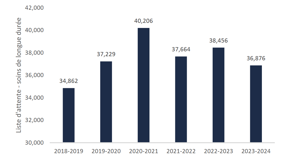 Ce graphique illustre la liste d’attente prévue pour un lit de soins de longue durée de l’exercice 2018 2019 à l’exercice 2023-2024. Le graphique montre que le nombre de personnes figurant sur la liste d’attente pour un lit de soins de longue durée était de 34 862 en 2018-2019 et sera de 37 229 en 2019-2020, 40 206 en 2020-2021, 37 664 en 2021-2022, 38 456 en 2022-2023 et 36 876 en 2023-2024.