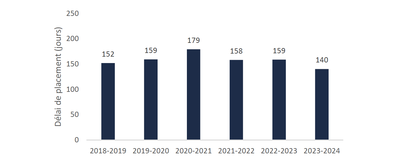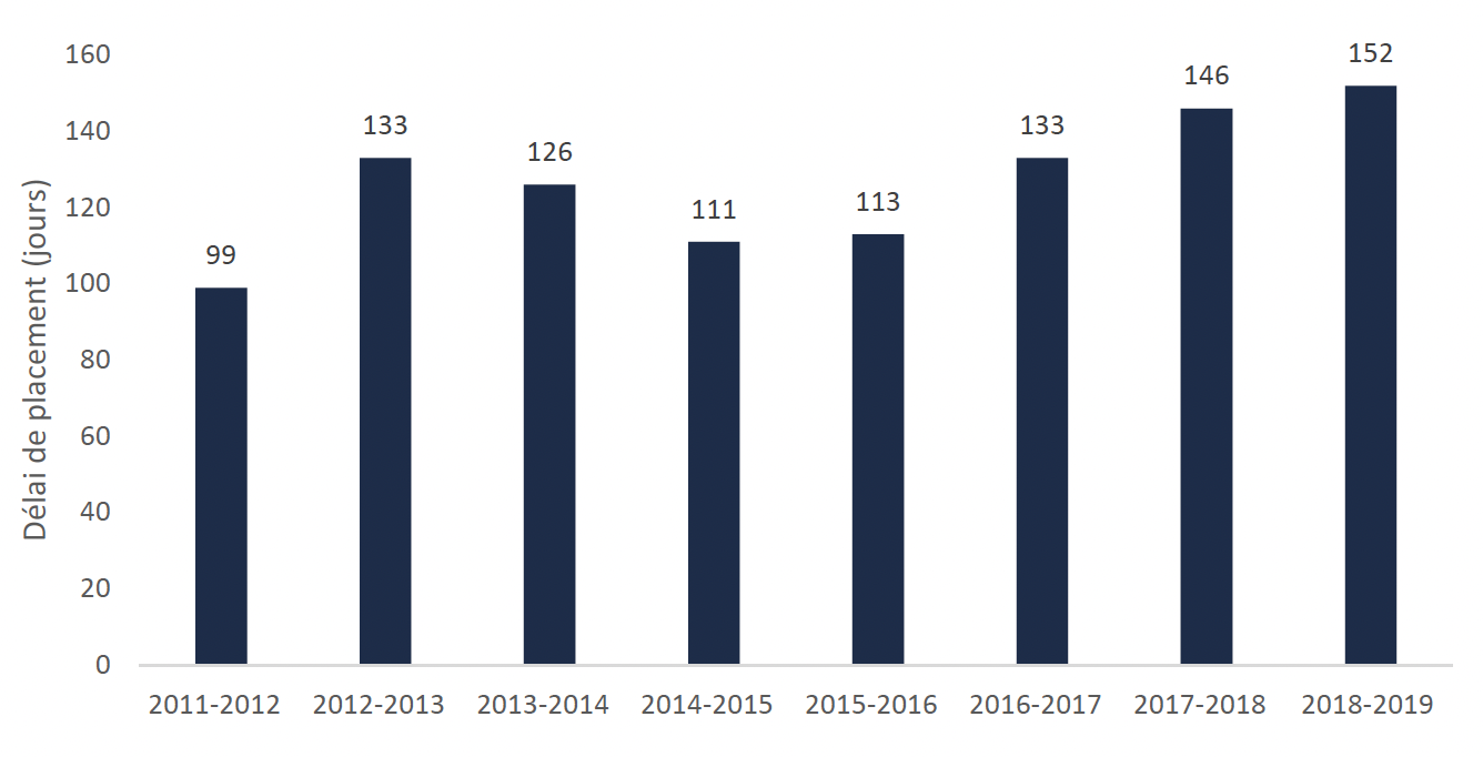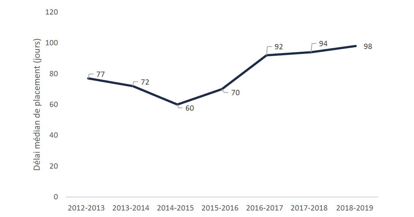 Cet allongement de la liste d’attente a également fait augmenter les temps d’attente pour obtenir des soins de longue durée. De 2011-2012 à 2018-2019, le délai médian de placement (ou temps d’attente) dans un lit de soins de longue durée s’est allongé, passant de 99 jours à 152 jours.