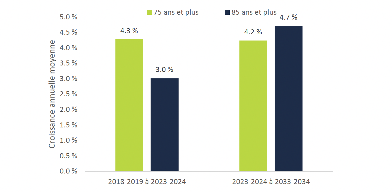 Après 2023-2024, pour maintenir à environ 36 900 le nombre de personnes inscrites sur la liste d’attente prévue, la province devrait créer 55 000 nouveaux lits de soins de longue durée d’ici 2033-2034. La nécessité d’ajouter 55 000 lits de soins de longue durée pour stabiliser la liste d’attente procède de la croissance plus élevée que prévu de la demande de soins de longue durée. De 2023-2024 à 2033-2034, le taux de croissance de la population ontarienne âgée de 85 ans et plus devrait atteindre en moyenne 4,7 % par année, par rapport à un taux annuel moyen de 3,0 % par année de 2018-2019 à 2023-2024.