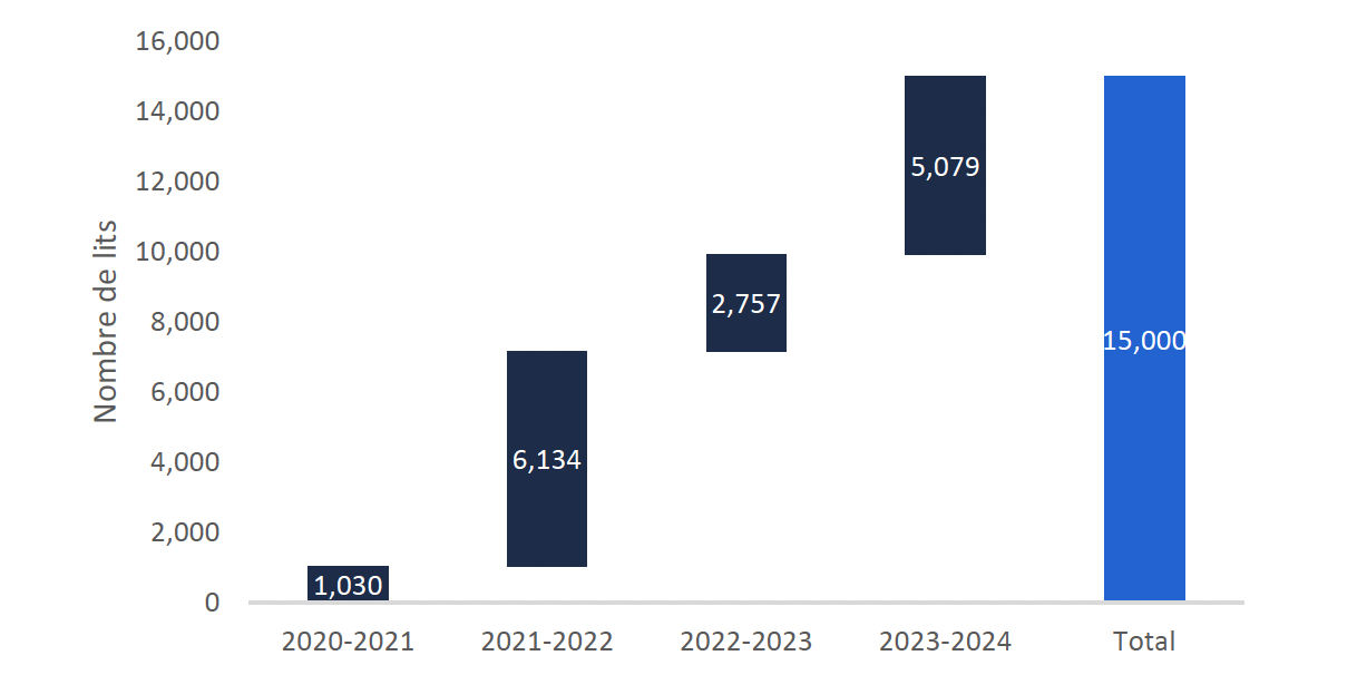 Le nombre de lits en service est calculé en fonction du nombre de lits existants et des prévisions du BRF quant au moment où les 15 000 nouveaux lits seront en service, moins le nombre de lits qui seront momentanément inoccupés en attendant leur réaménagement.