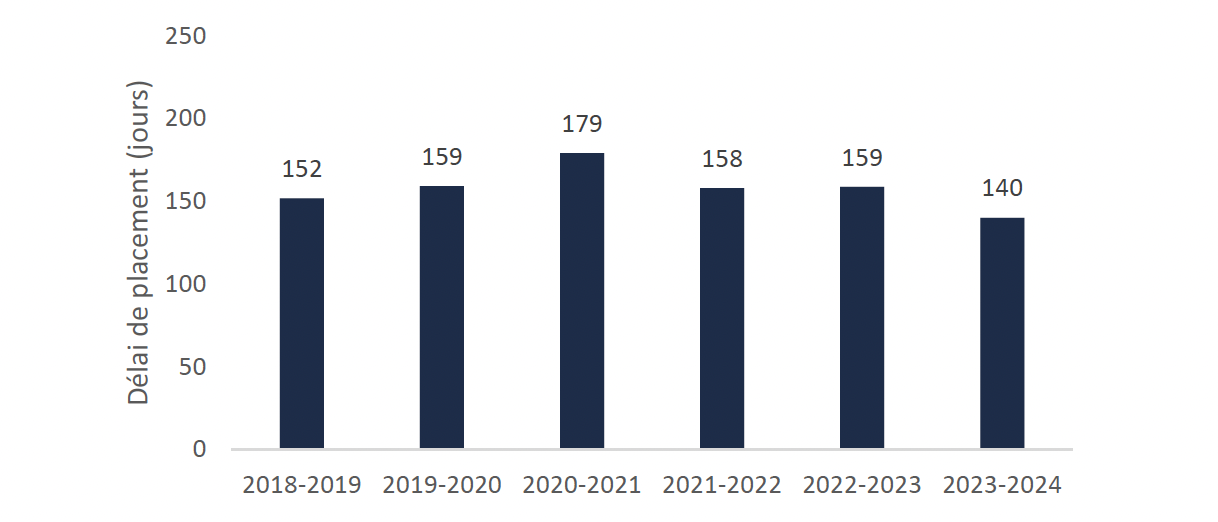 Ce graphique illustre les prévisions quant au délai médian de placement (temps d’attente) dans un lit de soins de longue durée en jours pour chaque exercice financier de 2018-2019 à 2023-2024. Le graphique montre que le temps médian d’attente est de 152 jours en 2018-2019, 159 jours en 2019-2020, 179 jours en 2020-2021, 158 jours en 2021-2022, 159 jours en 2022-2023 et 140 jours en 2023-2024.