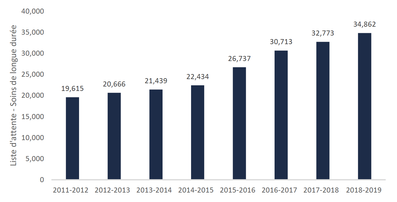 En 2018-2019, près de 35 000 Ontariennes et Ontariens étaient inscrits sur la liste d’attente pour obtenir un lit de soins de longue durée. Cette liste s’est allongée considérablement depuis 2011-2012; le nombre de personnes qui y sont inscrites s’est accru d’environ 78 % au cours des sept dernières années.