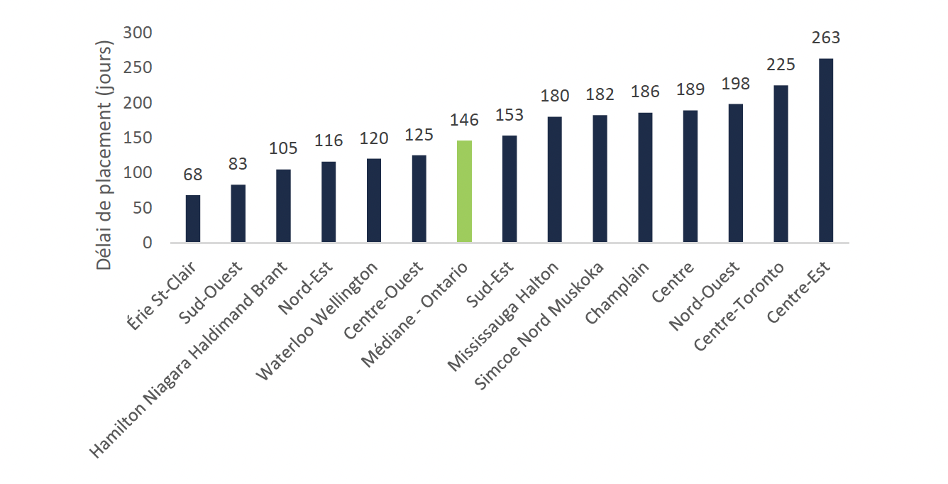 En Ontario, les temps d’attente pour les soins de longue durée varient considérablement selon la région. La province fait le suivi de ces temps d’attente dans chaque région relevant des 14 réseaux locaux d’intégration des services de santé (RLISS) de la province[7]. En 2017-2018, le temps d’attente médian pour un lit de soins de longue durée variait entre 263 jours dans le RLISS du Centre-Est et 68 jours dans le RLISS d’Érié St-Clair.
