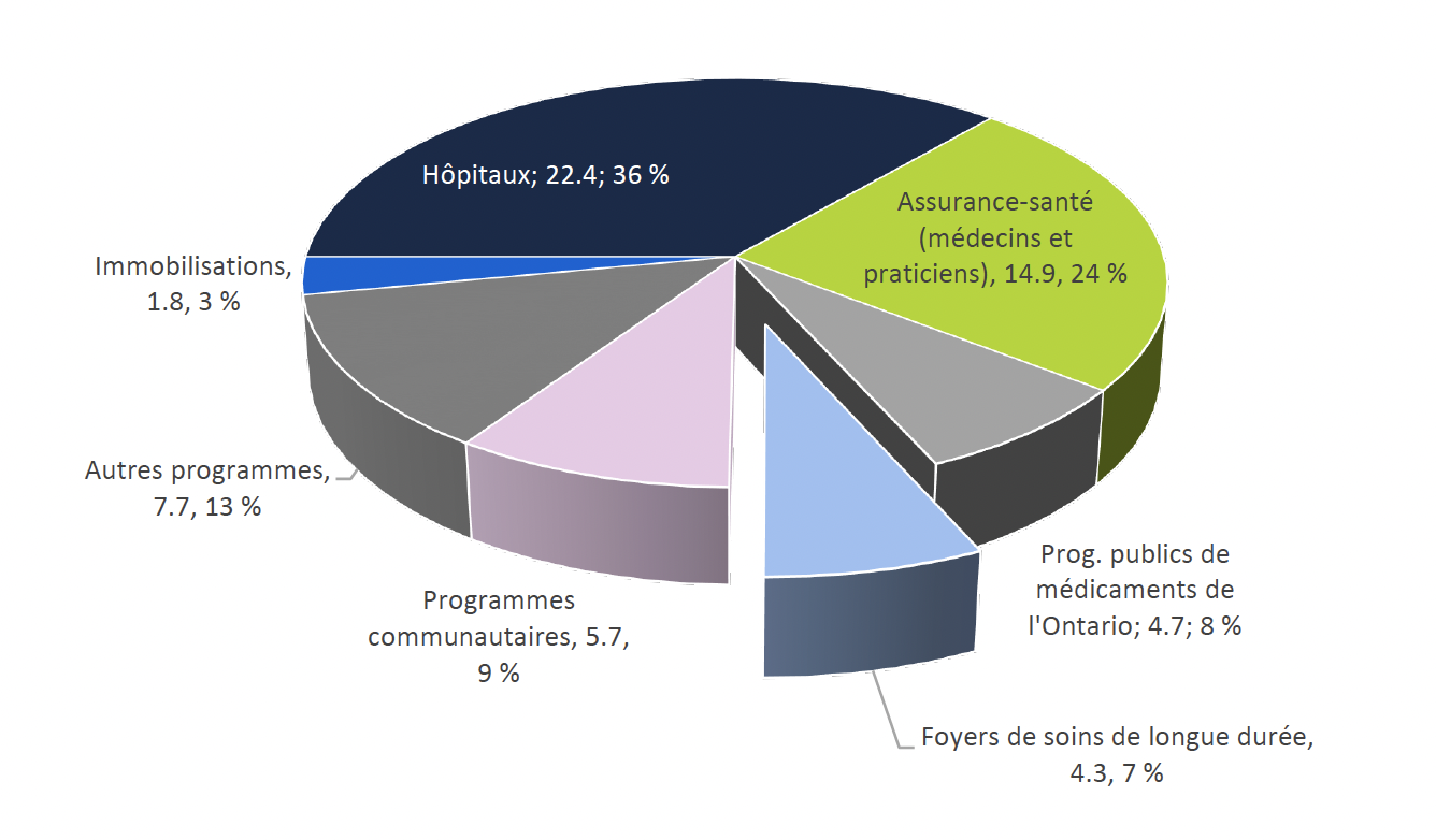 Ce graphique circulaire ventile les dépenses totales du secteur de la santé de l’Ontario en 2018-2019, en milliards de dollars. Le graphique montre que 22,4 milliards de dollars, or 36 %, ont été consacrés aux hôpitaux, 14,9 milliards de dollars, ou 24 %, à l’Assurance-santé de l’Ontario, 4,7 milliards de dollars, ou 8 %, aux programmes publics de médicaments de l’Ontario, 5,7 milliards de dollars, ou 9 %, aux programmes communautaires, 7,7 milliards de dollars, ou 13 %, à d’autres programmes, et 1,8 milliard de dollars, ou 3 %, aux immobilisations. Le graphique souligne que 4,3 milliards de dollars, ou 7 %, ont été affectés aux foyers de soins de longue durée.