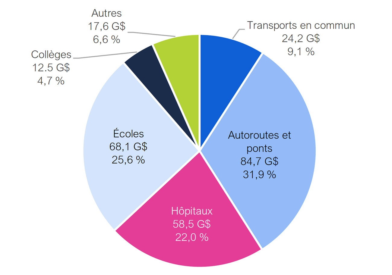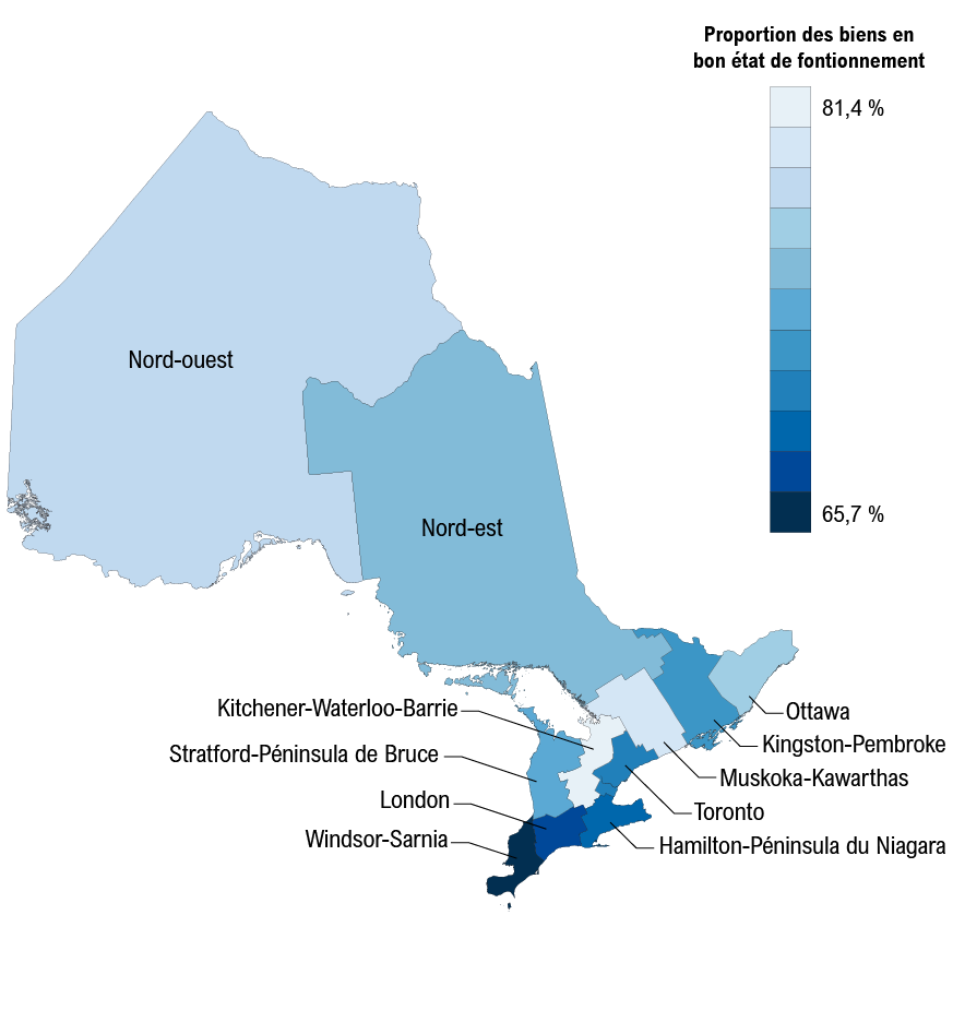 Le gouvernement de l’Ontario (la province) possède environ 38 % de l’infrastructure publique en Ontario, les municipalités en possèdent 52 % et le gouvernement du Canada 10 %[9]. La propriété de l’infrastructure publique varie selon le type de bien. Par exemple, l’infrastructure de traitement des eaux usées est principalement la propriété des municipalités alors que l’infrastructure de transport (réseau routier et autoroutier, ainsi que les biens de transport collectif) est principalement la propriété de la province et des municipalités[10].