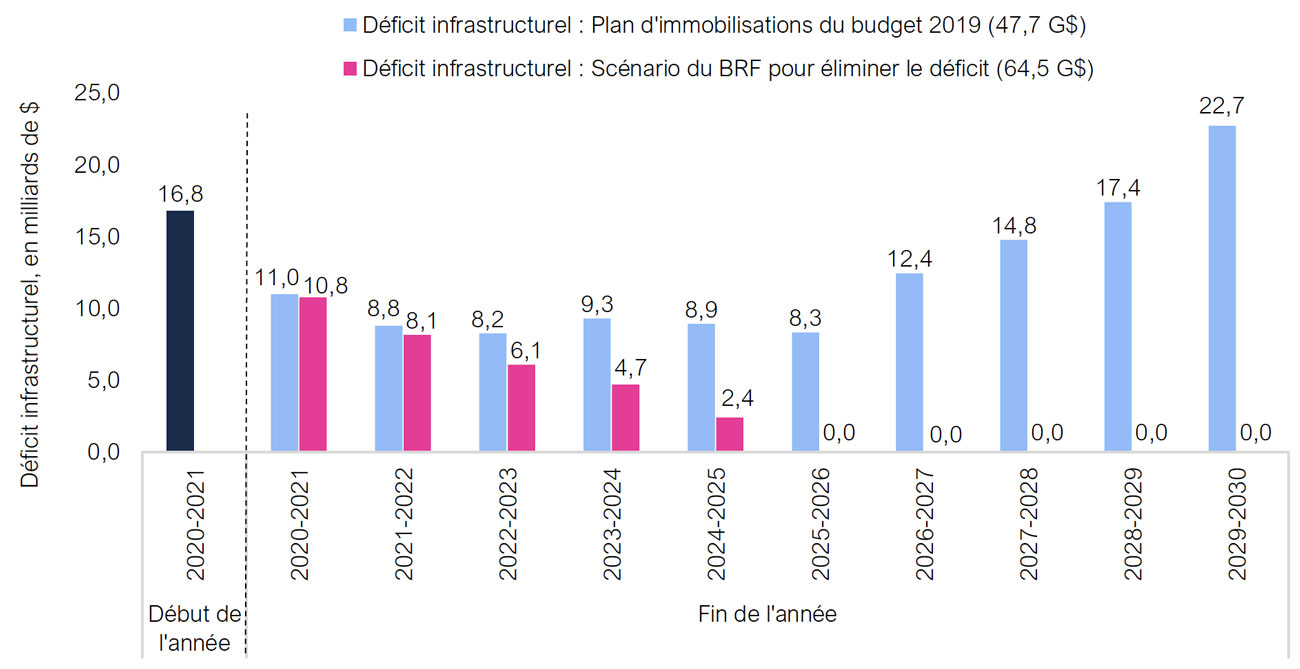 [46] Le déficit infrastructurel estimé en 2029-2030 est 22,7 milliards de dollars plus important que l’écart de financement de 16,9 milliards de dollars intervenant entre le scénario du BRF afin d’éliminer le déficit et le plan d’immobilisations du budget 2019. La différence entre l’écart de financement et le déficit peut être largement attribuée à l’affectation du financement entre secteurs prévu au plan d’immobilisations et le profil annuel des dépenses en immobilisations entre secteurs. Pour éliminer efficacement le déficit, les dépenses en immobilisations doivent être ciblées par secteur et par année au sein des secteurs. Même si un secteur est financé adéquatement pour éliminer le déficit sur 10 ans, si ces dépenses ne sont pas ciblées et distribuées en fonction des besoins annuels, un déficit peut néanmoins survenir.