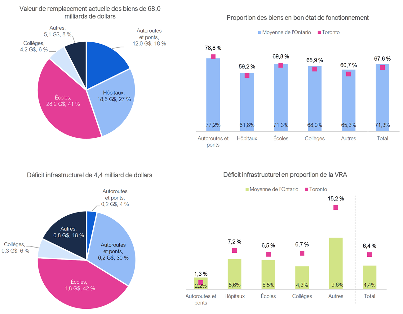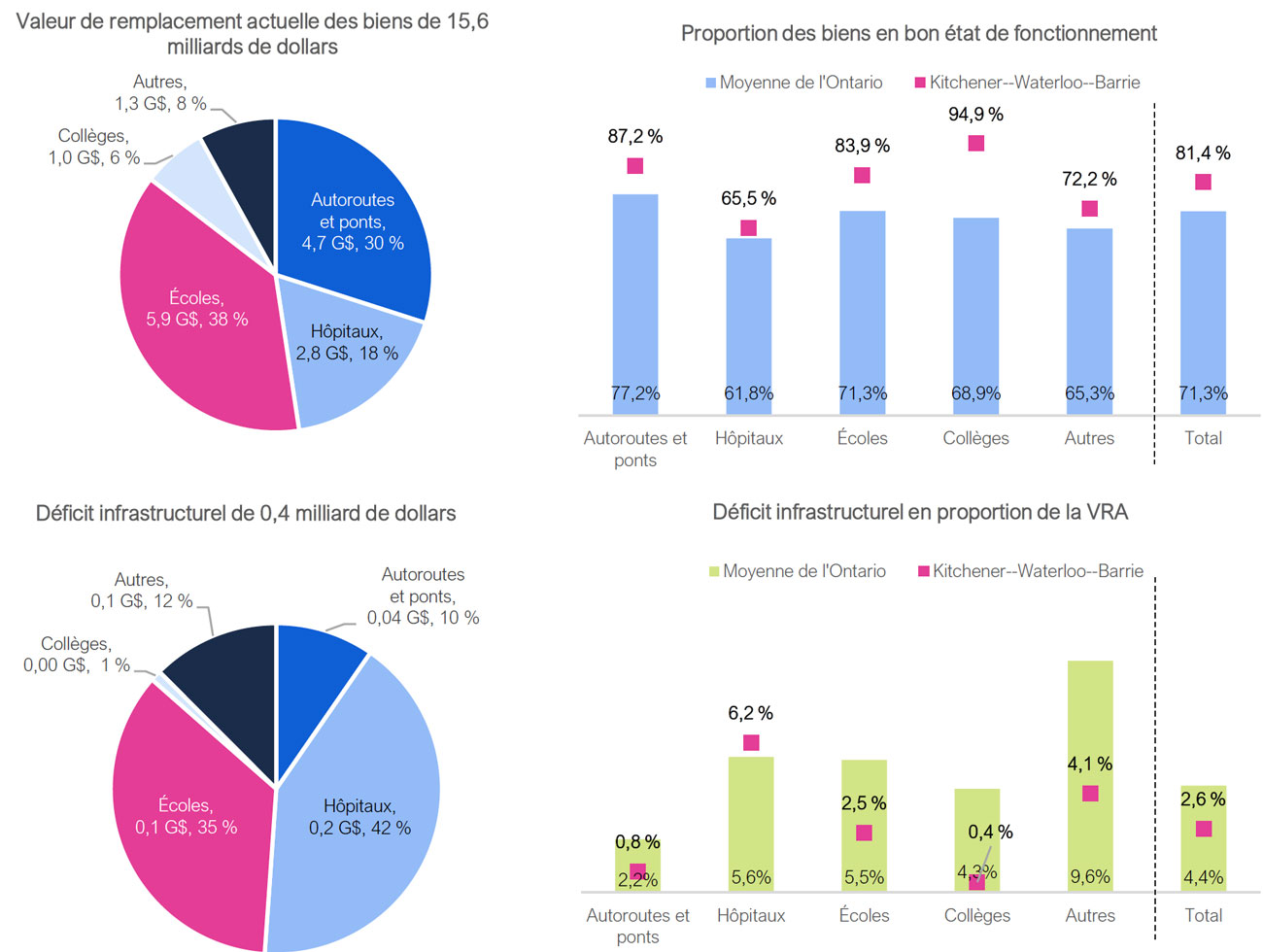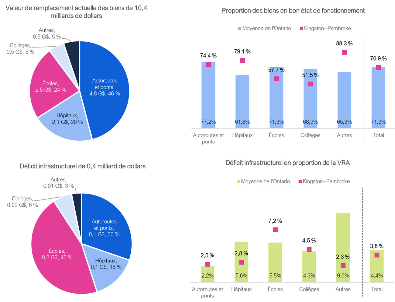 Le but de ce rapport est d’offrir un aperçu des biens d’infrastructure que possède la province ainsi qu’une évaluation de l’état de ces biens. La première partie de ce rapport examine l’infrastructure dont la province est propriétaire et présente une estimation de sa valeur. La deuxième section évalue l’état de fonctionnement de l’infrastructure de la province et présente une estimation du déficit infrastructurel. La dernière partie de ce rapport est consacrée aux prévisions de l’investissement requis pour éliminer le déficit infrastructurel et maintenir les biens de la province dans un bon état de fonctionnement au cours des dix prochaines années. Le rapport compare ensuite le niveau d’investissement en capital requis avec ce que la province avait initialement prévu dans son plan d’immobilisations du budget de l’Ontario en 2019[18].
