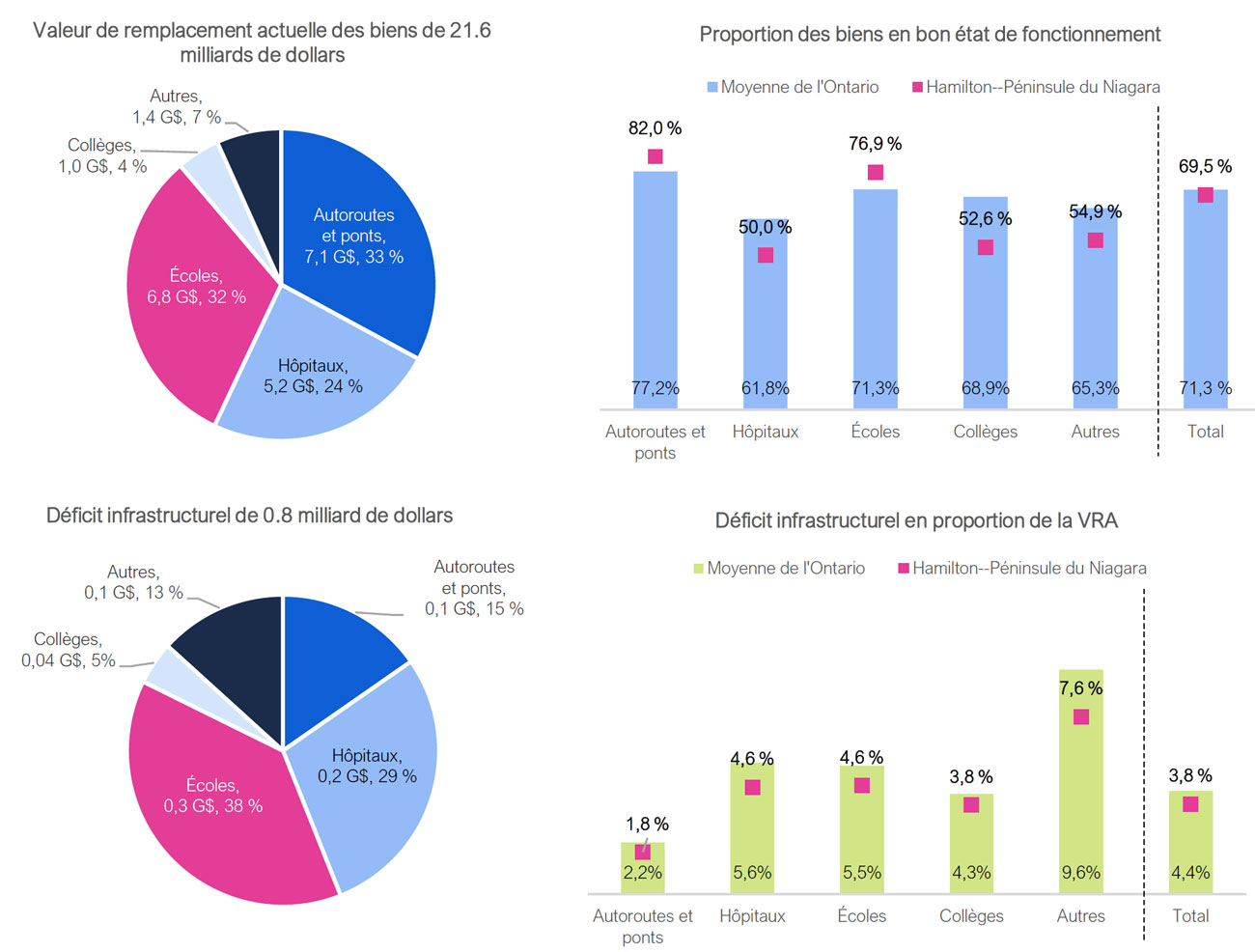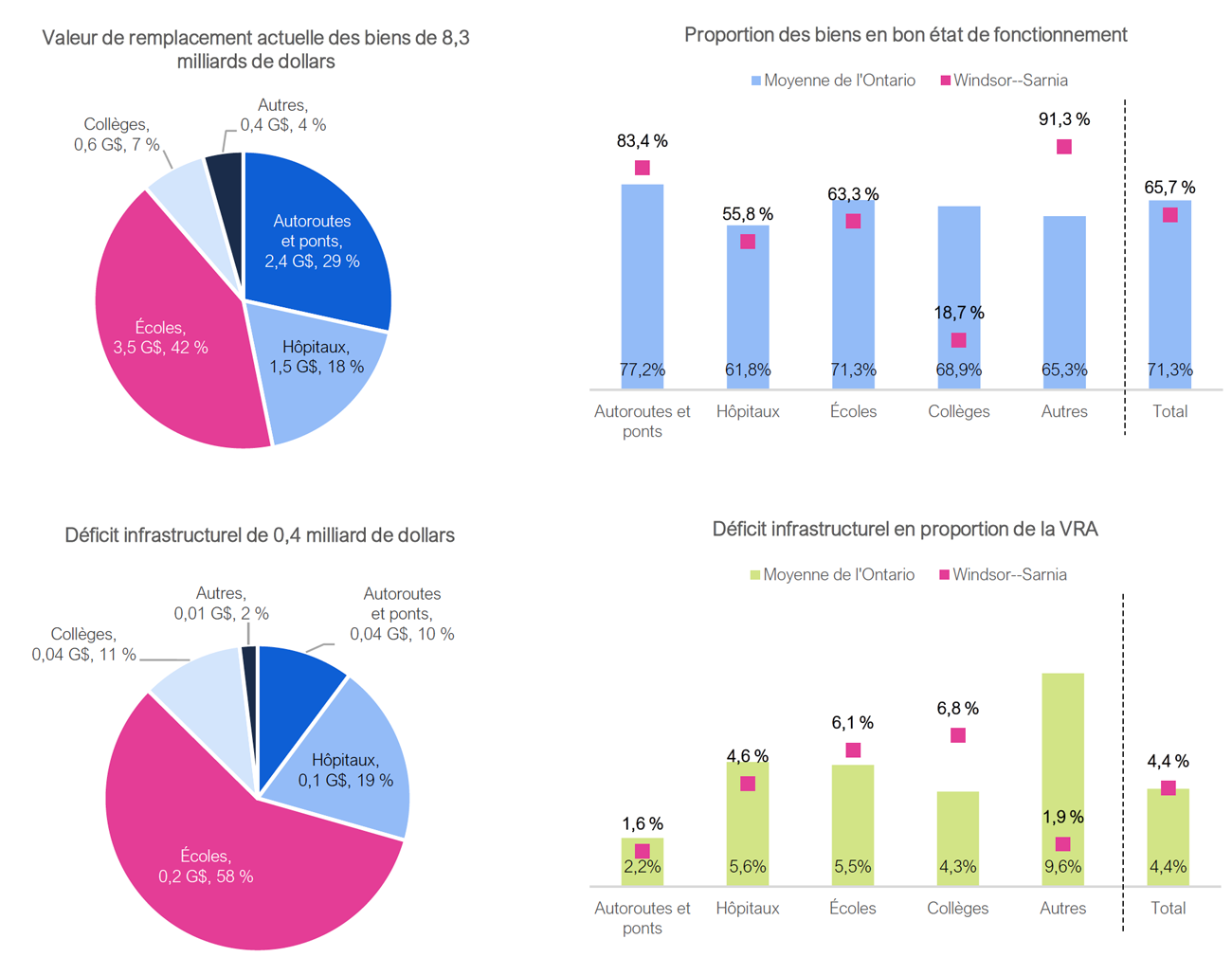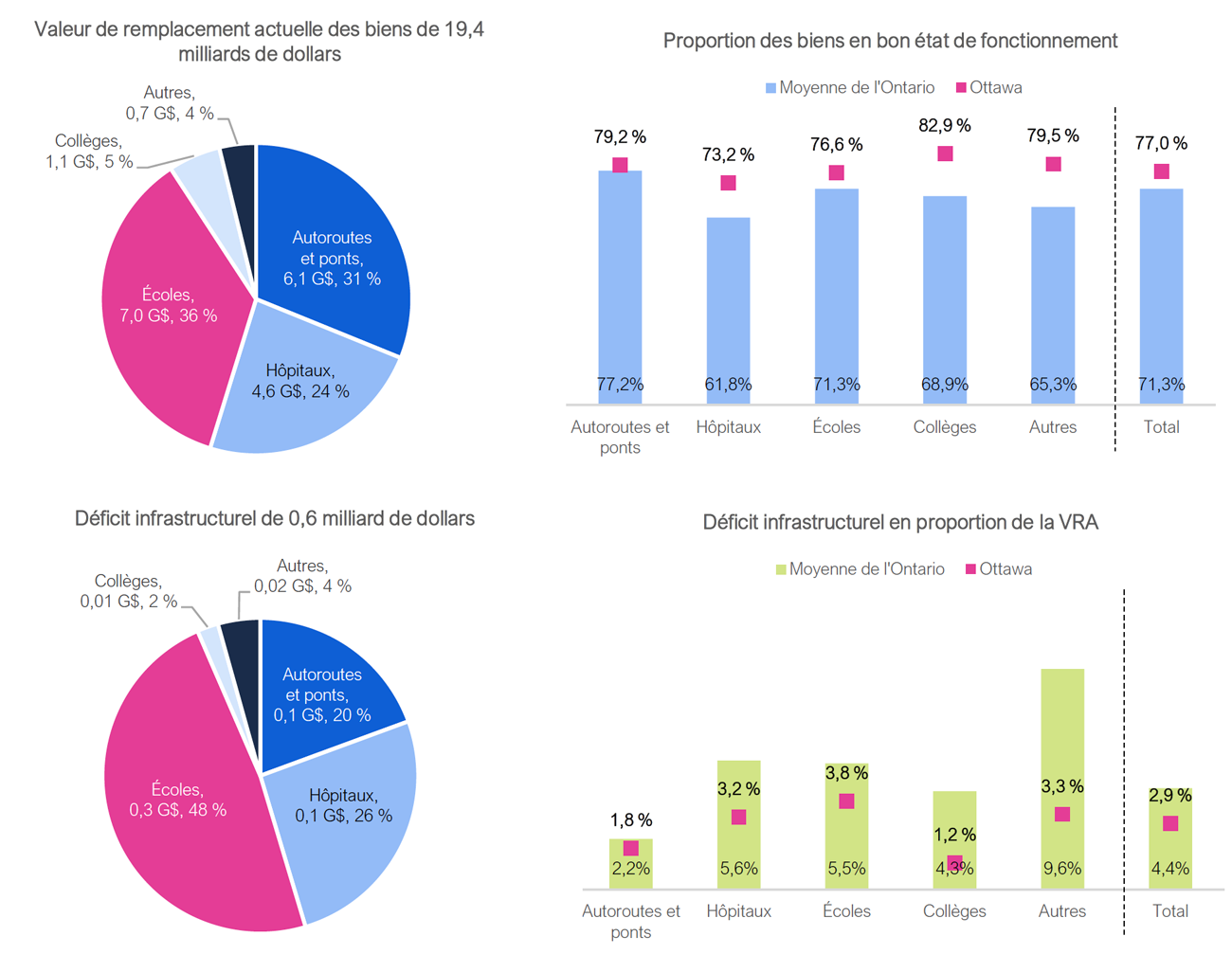 Le but de ce rapport est d’offrir un aperçu des biens d’infrastructure que possède la province ainsi qu’une évaluation de l’état de ces biens. La première partie de ce rapport examine l’infrastructure dont la province est propriétaire et présente une estimation de sa valeur. La deuxième section évalue l’état de fonctionnement de l’infrastructure de la province et présente une estimation du déficit infrastructurel. La dernière partie de ce rapport est consacrée aux prévisions de l’investissement requis pour éliminer le déficit infrastructurel et maintenir les biens de la province dans un bon état de fonctionnement au cours des dix prochaines années. Le rapport compare ensuite le niveau d’investissement en capital requis avec ce que la province avait initialement prévu dans son plan d’immobilisations du budget de l’Ontario en 2019[18].
